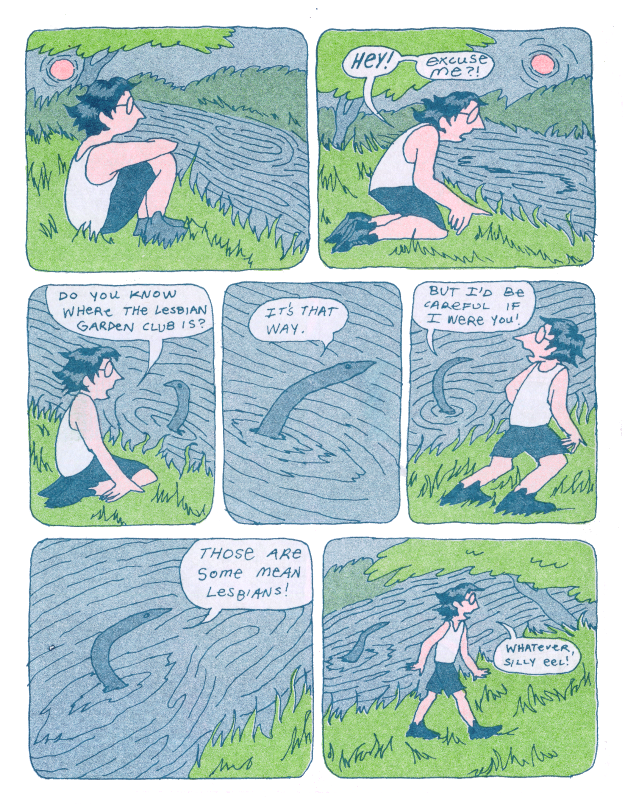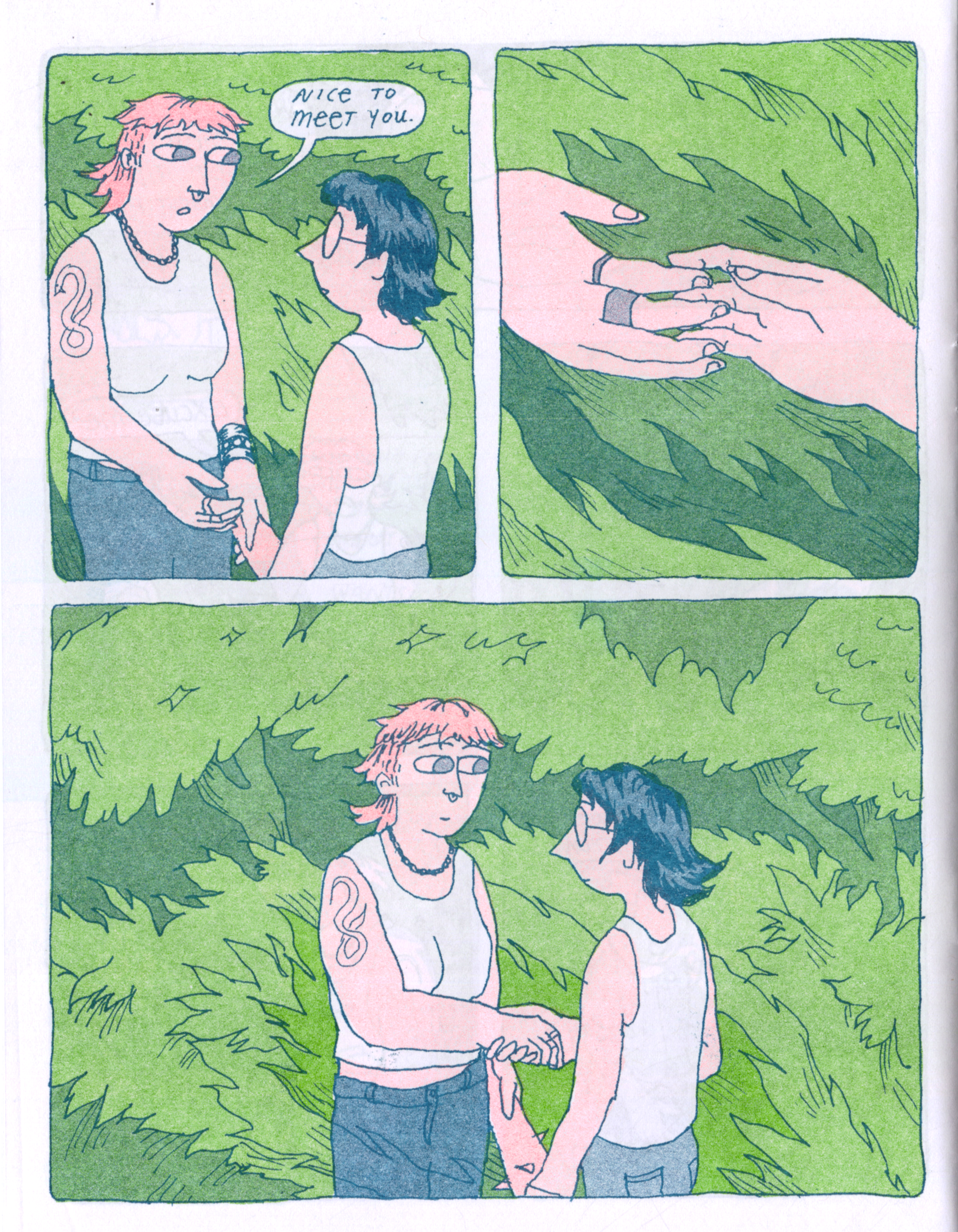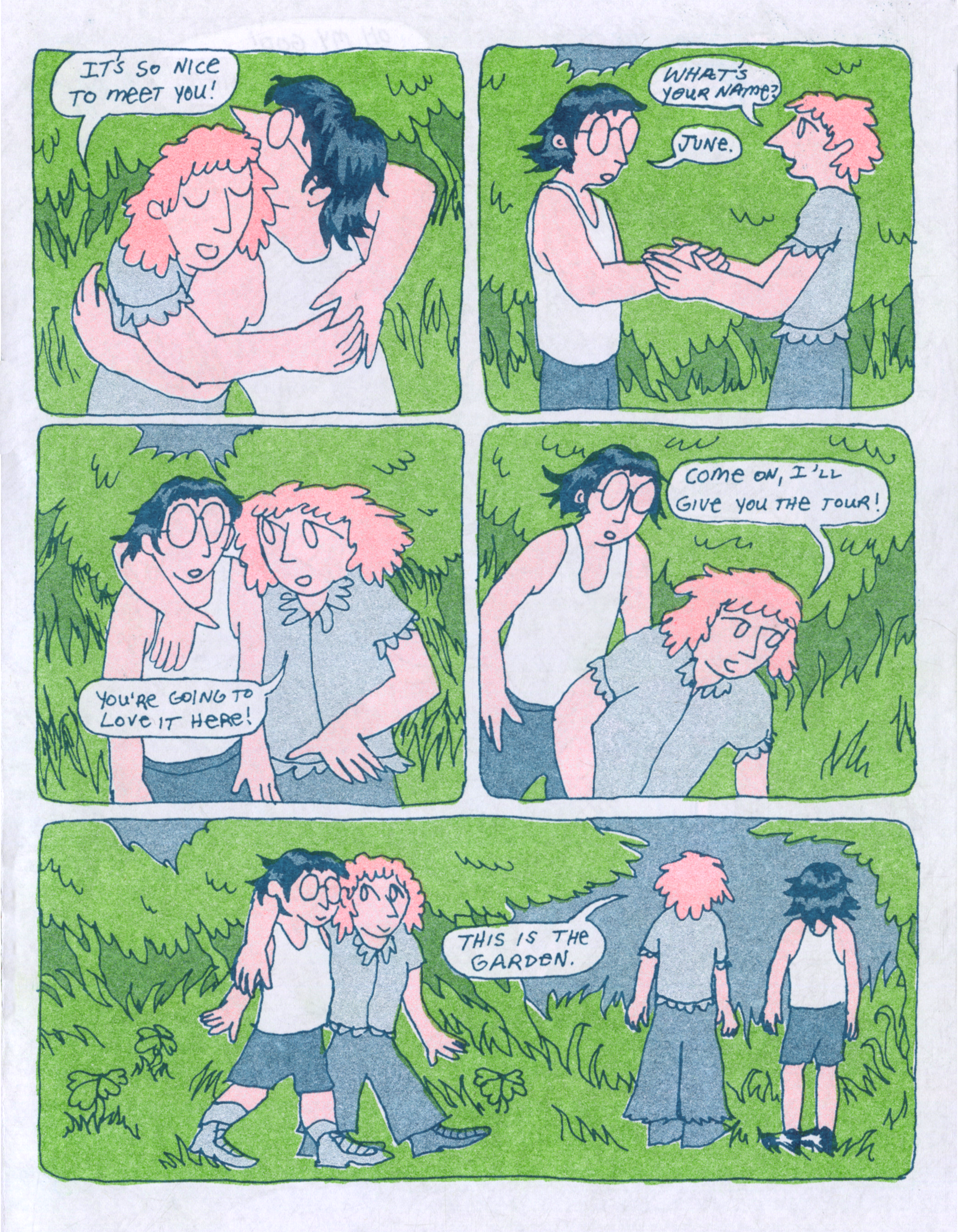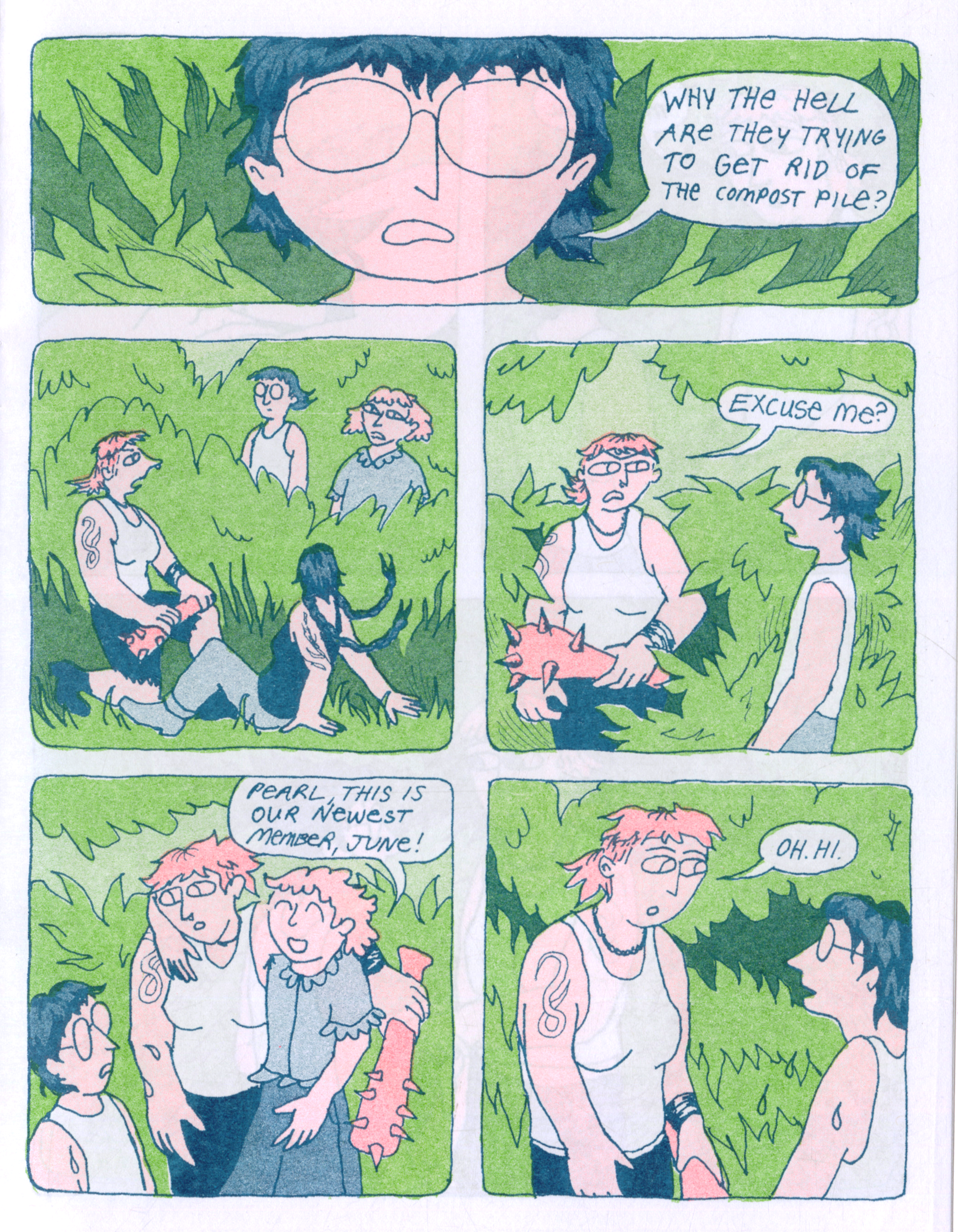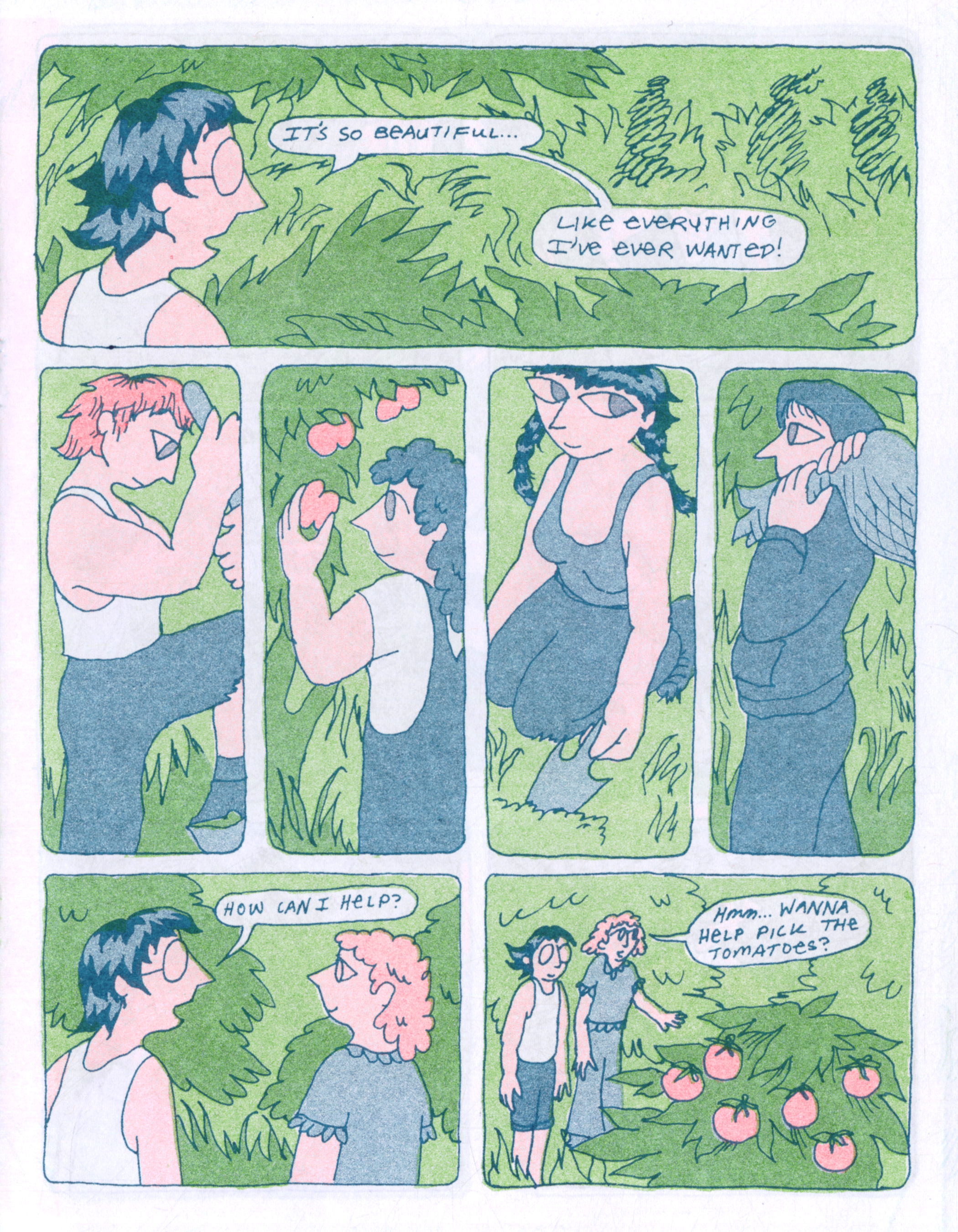 Excerpts from Garden Club, a 20 page risograph comic about a lesbian gardening co-op. Printed in June 2025.